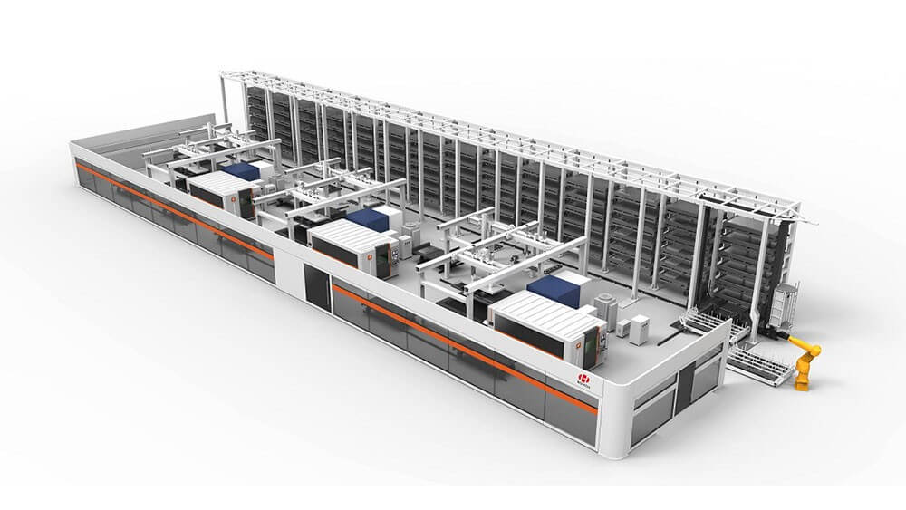 HGTECH Laser Cutting Flexible Production Line includes multiple sets of laser cutting automated material warehouses